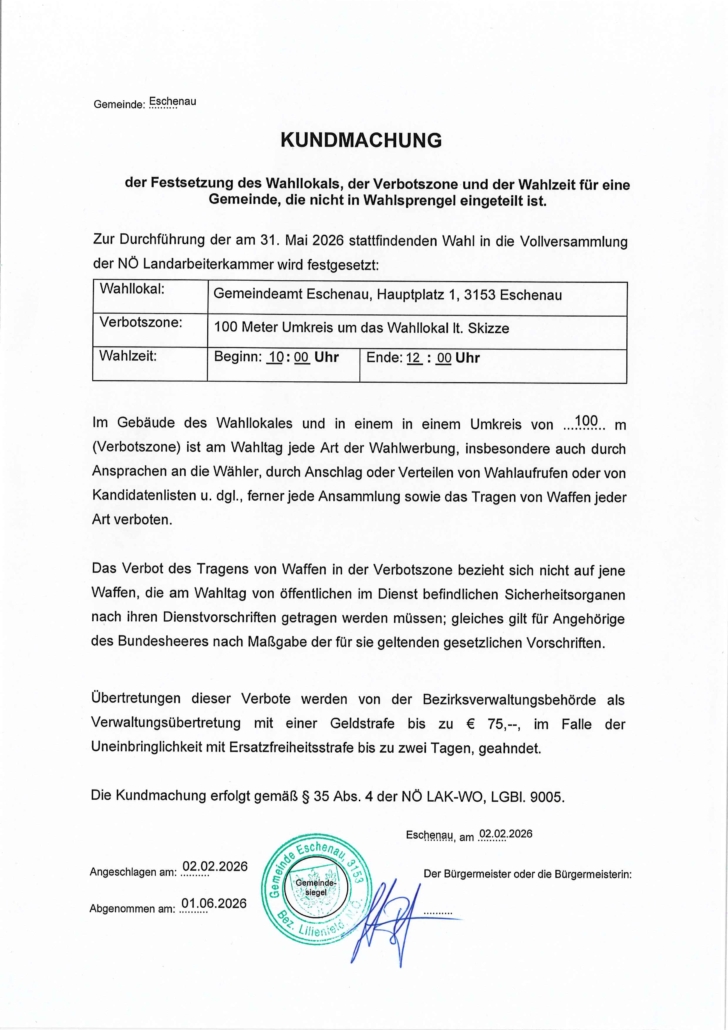 Du bist hier: Startseite1 / Amtstafel2 / Kundmachung Wahllokal, Verbotszone & Wahlzeit Landarbeiterkammerwahl...